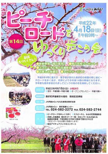 [:W480] 僕ホタピー! 毎年恒例のピーチロードをゆっくり歩こう会(主催JA伊達みらいもも生産部会桑折支部)が今年は4月18日(日)午前10時から開催されるよ。 ミスピーチとの写真撮影会やお楽しみ抽選会、アマチュアバンドのコンサートなど盛りだく…